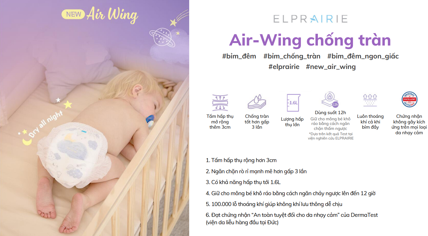Bỉm đêm Air-Wing thế hệ mới với 6 ưu điểm vượt trội không thể bỏ qua: 1. Tấm hấp thụ rộng hơn 3cm 2. Ngăn chặn rò rỉ mạnh mẽ hơn gấp 3 lần 3. Có khả năng hấp thụ tới 1.6L 4. Giữ cho mông bé khô ráo bằng cách ngăn chảy ngược lên đến 12 giờ 5. 100.0...