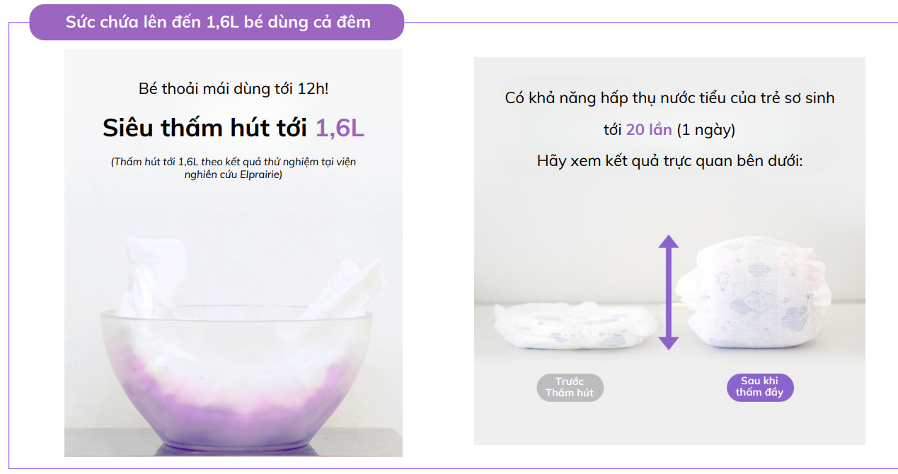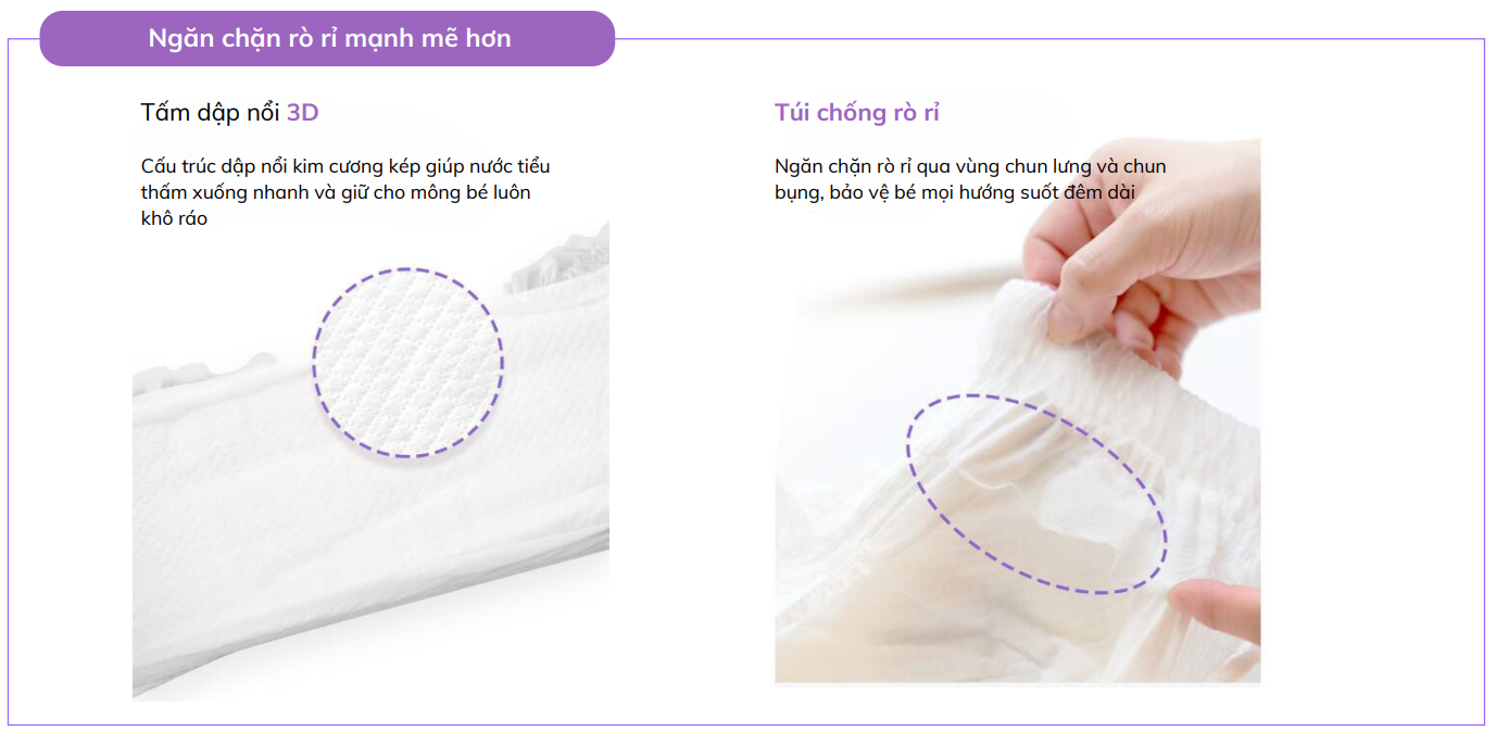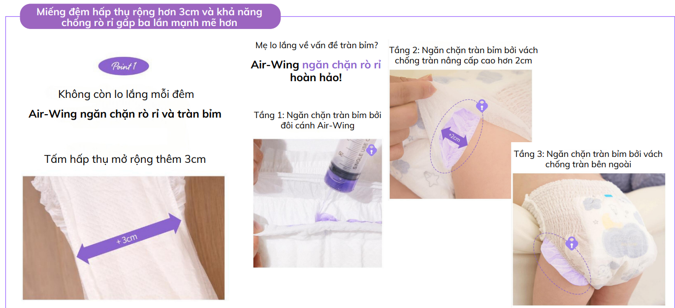 - Thiết kế ấn tượng 2 cánh: Giúp tăng diện tích thấm hút tạo hiệu quả thấm hút với tốc độ nhanh nhất trong mọi loại bỉm, khi bé tè nhiều nước cũng thoát xuống rãnh ở 2 cánh để da bé ko phải tiếp xúc với nước tiểu, đặc biệt phù hợp khi bé đóng bỉm ban đêm, hay bé thường xuyên nằm nghiêng về 1 phía