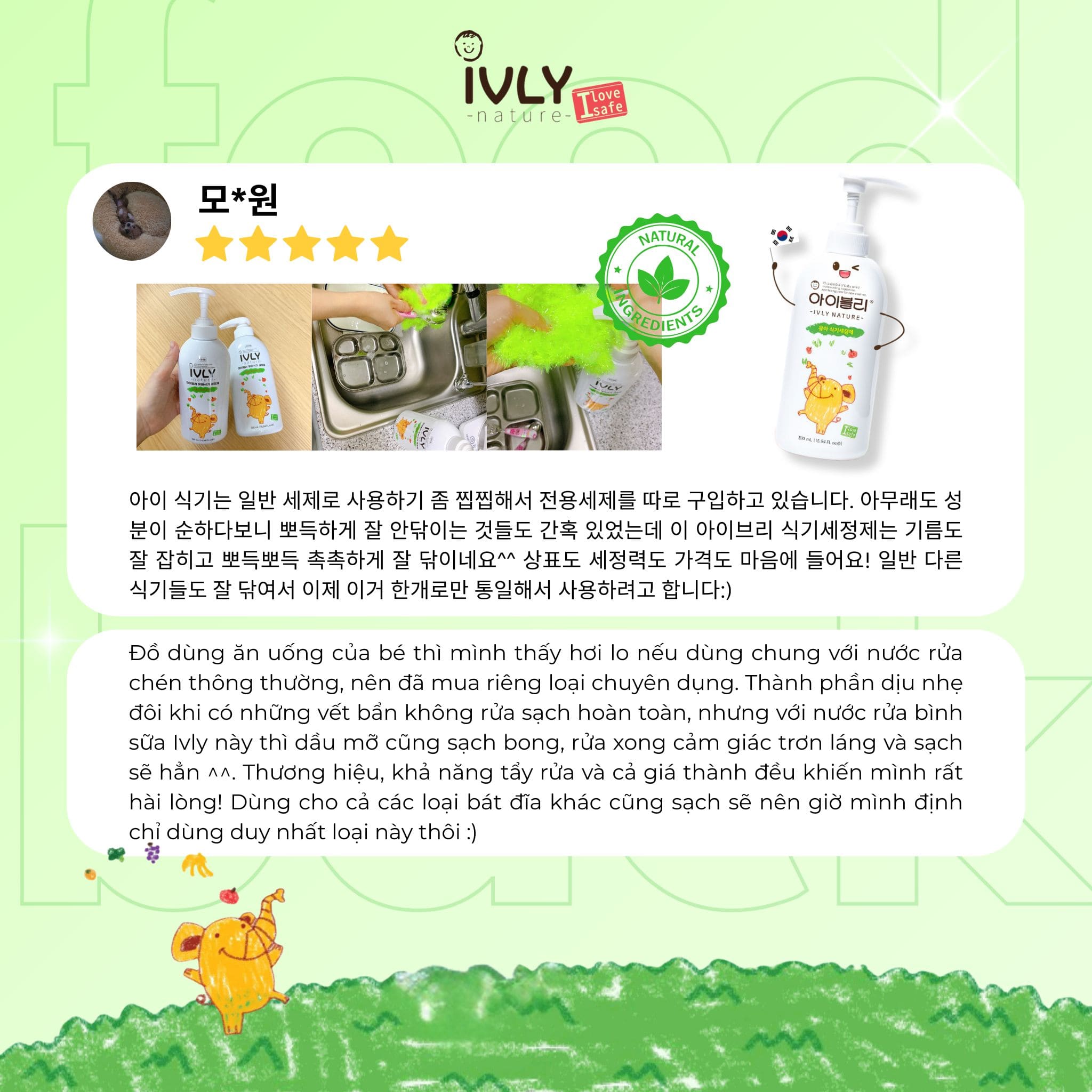 "Bát đĩa, bình sữa của con, mình chẳng bao giờ dám dùng chung nước rửa chén thông thường. Trước kia, mỗi lần rửa bình sữa cho bé, mình luôn phải tráng đi tráng lại nhiều lần, mà vẫn canh cánh nỗi lo còn tồn dư chất tẩy. Từ ngày chuyển sang Ivly Nature, mình thấy yên tâm hơn hẳn. Dầu mỡ bám trên bình, bát đĩa rửa sạch bong, khô ráo mà tay mẹ vẫn mềm mại. Không còn cảm giác khô ráp hay mùi hắc hóa chất ám lại nữa. Ivly giúp mình vừa chăm con an toàn, vừa chăm sóc chính bản thân mình.”