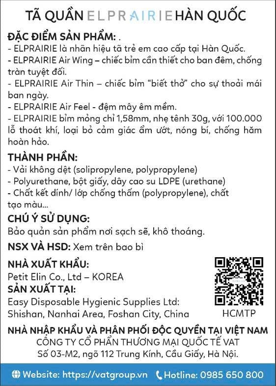 VAT Group / Elprairie Việt Nam (Website phân phối chính thức) - Đây là trang sản phẩm chính thức, thông tin sản phẩm đầy đủ, bảng size, có chính sách bảo hành/đổi trả rõ ràng. Nếu muốn chắc chắn 100% hàng chính hãng, ba mẹ có thể mua từ kênh này là hợp lý.