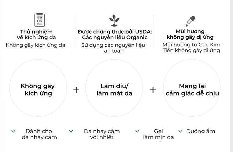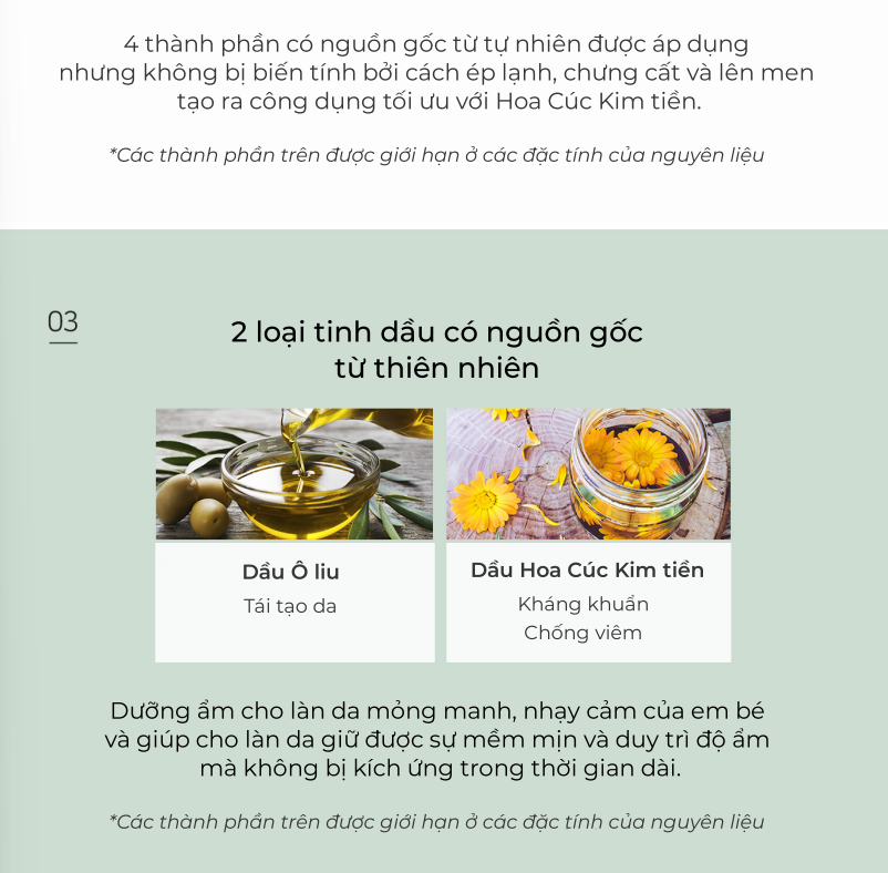 - 4 tinh chất có nguồn gốc từ thiên nhiên giúp duy trì độ ẩm cho da: lô hội, hoa cúc, tinh chất rau má, rau sam.