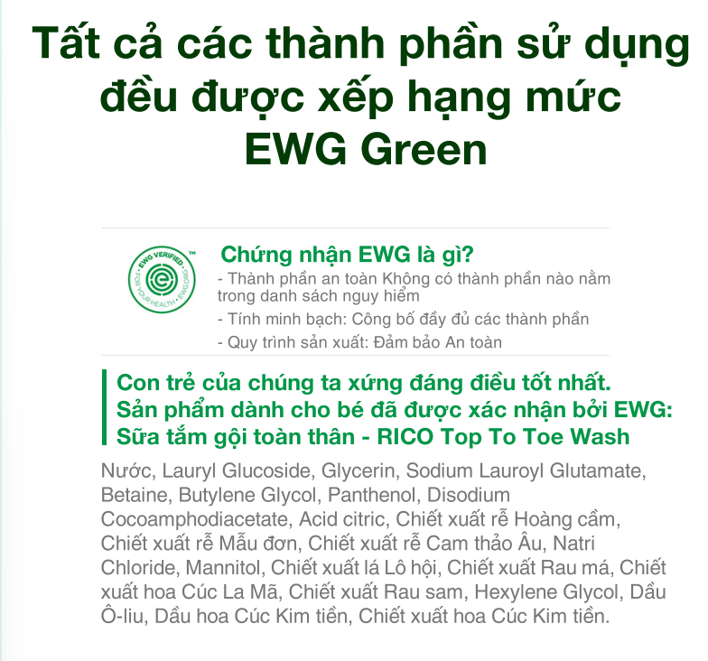 - Tất cả các thành phần sử dụng đều được xếp hạng mức EWG Green.