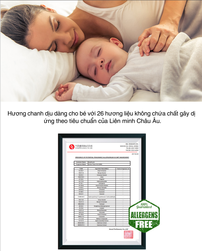 - Hương chanh dịu dàng cho bé với 26 hương liệu không chứa chất gây dị ứng theo tiêu chuẩn của Liên minh Châu Âu.