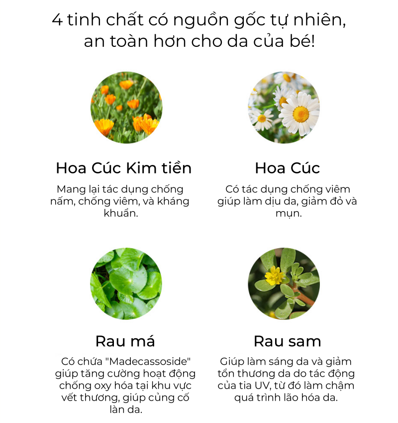 - 4 tinh chất tự nhiên: Hoa Cúc Kim tiền, Hoa cúc, Rau má, Rau sam