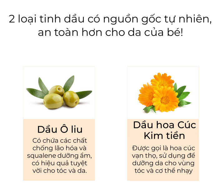 - 2 loại tinh dầu: Dầu Ô liu, Dầu hoa Cúc Kim tiền