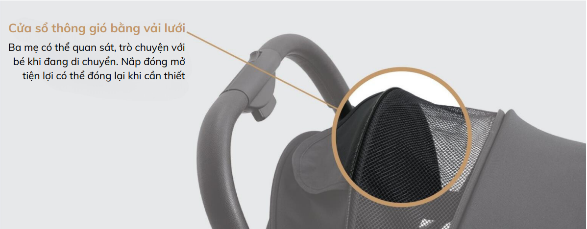 Mái che với chỉ số chức năng UPF 50+ bảo vệ thị lực của bé và có thể mở rộng linh hoạt, có nắp đóng mở giúp thông gió khi cần thiết.